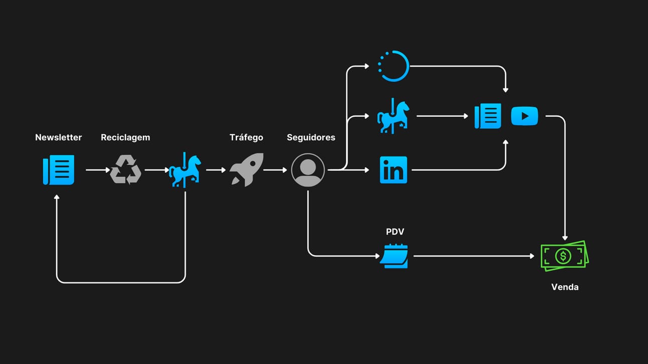 Criar Conteúdo Longo: Em newsletters, como essa que você está lendo. Nessas, sempre terei CTAs, mesmo que sutis, a meus produtos e serviços;